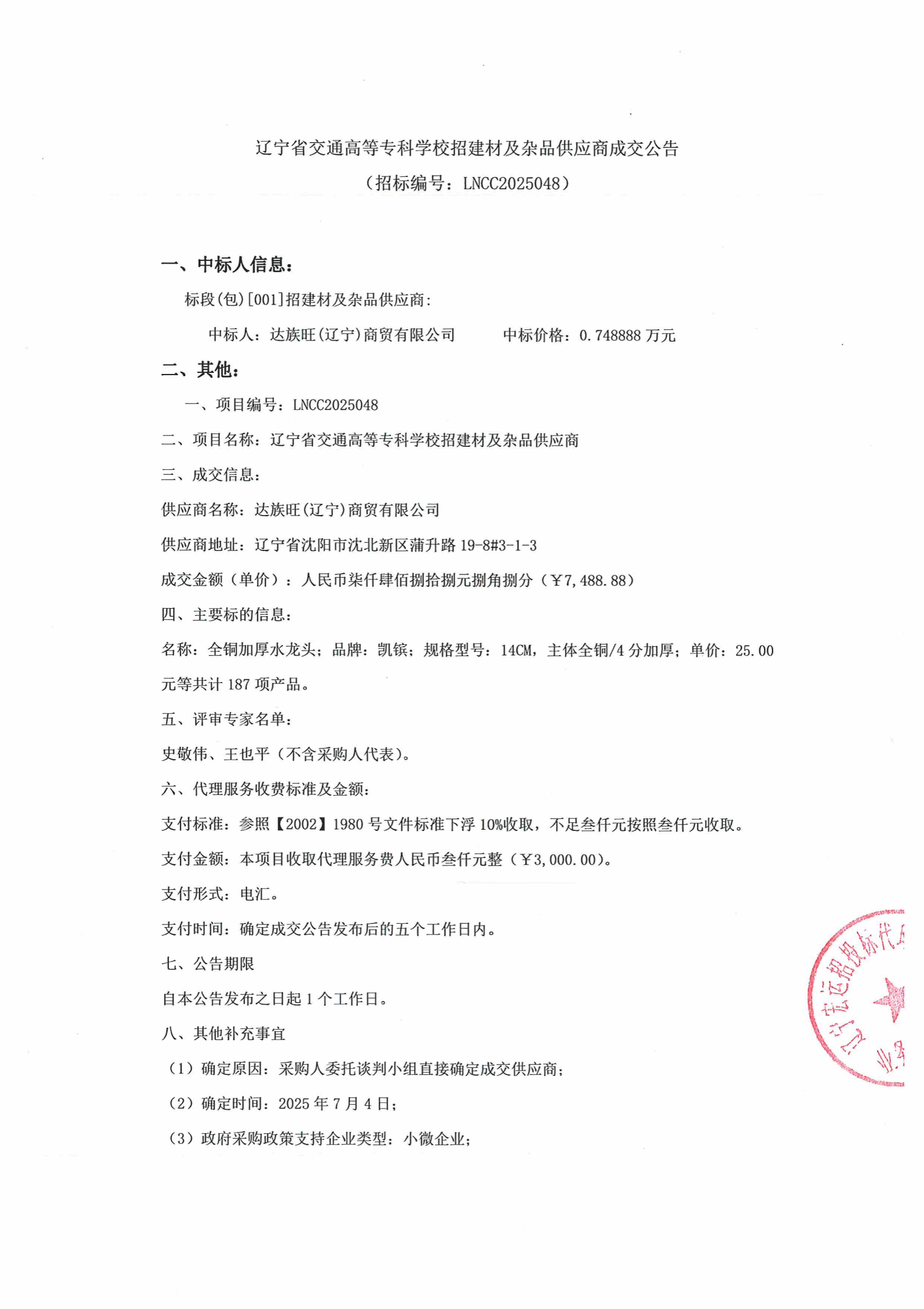 辽宁省交通高等专科学校招建材及杂品供应商成交公告(LNCC2025048)