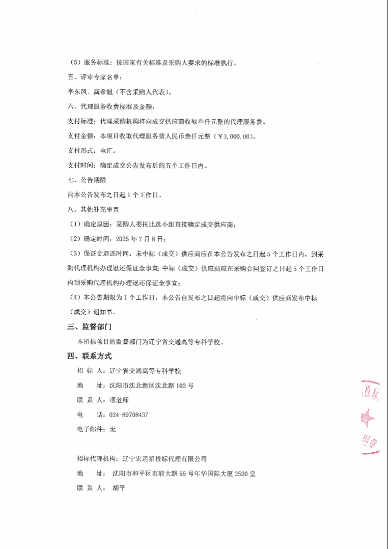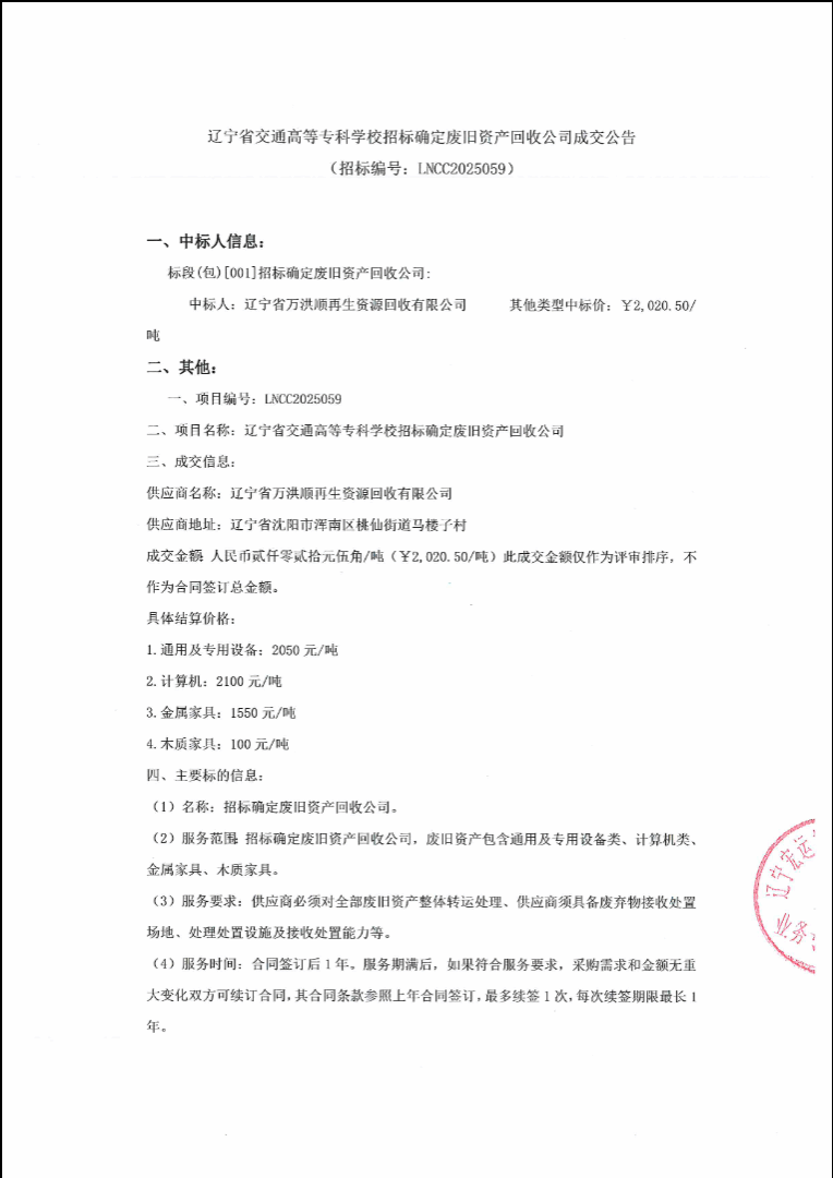 辽宁省交通高等专科学校招标确定废旧资产回收公司成交公告(LNCC2025059)