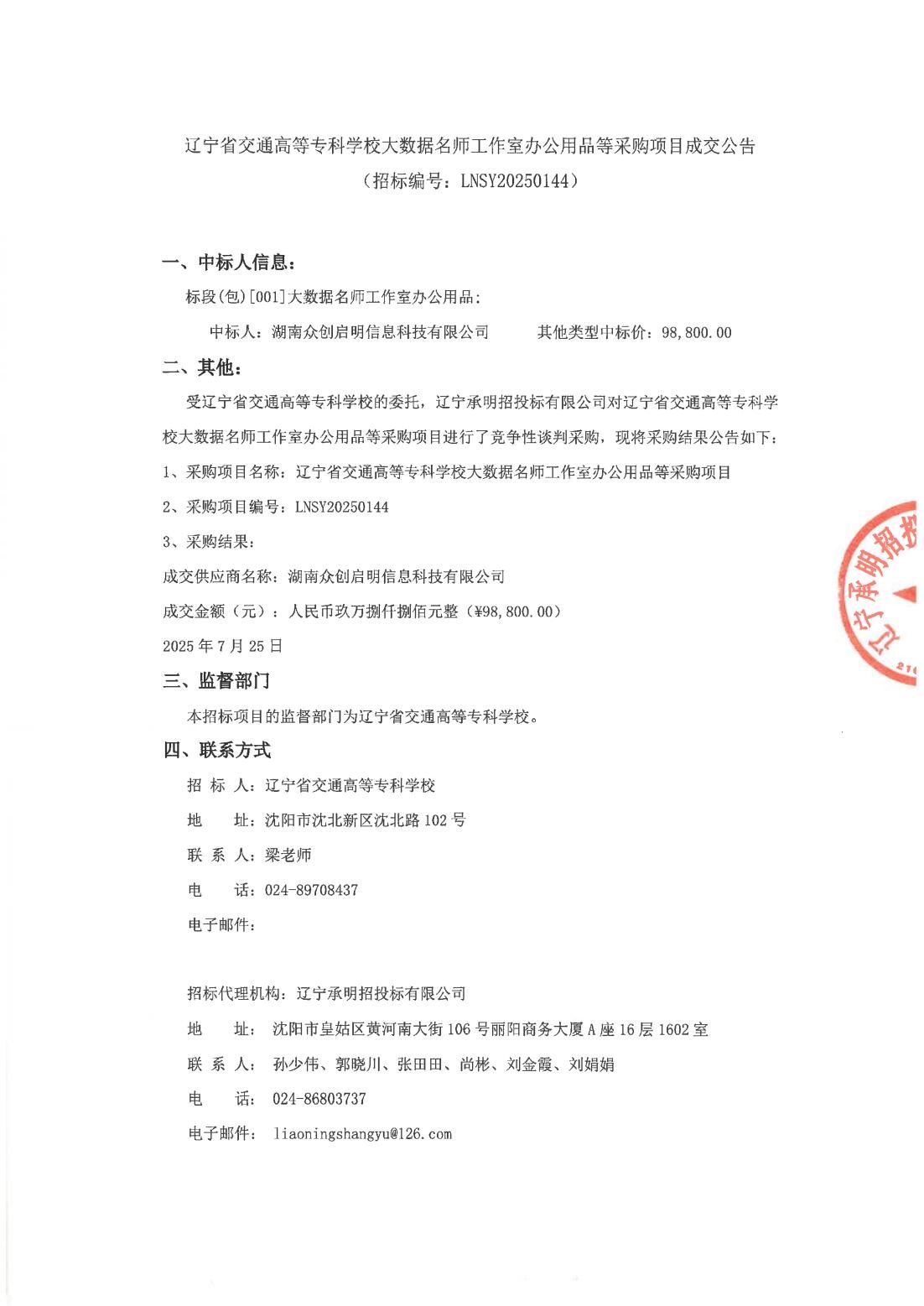 大数据名师工作室办公用品等采购项目结果公告(LNCC2025055)