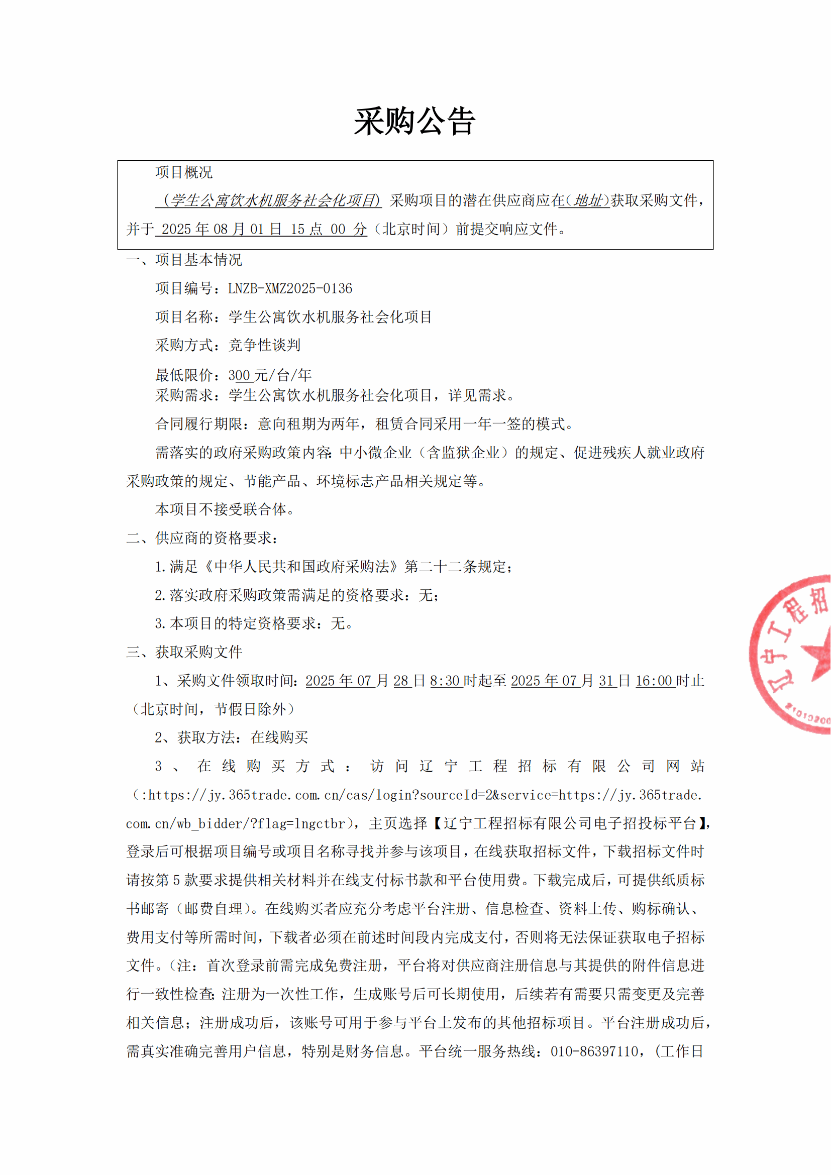 学生公寓饮水机服务社会化项目招标公告(LNCC2025095)