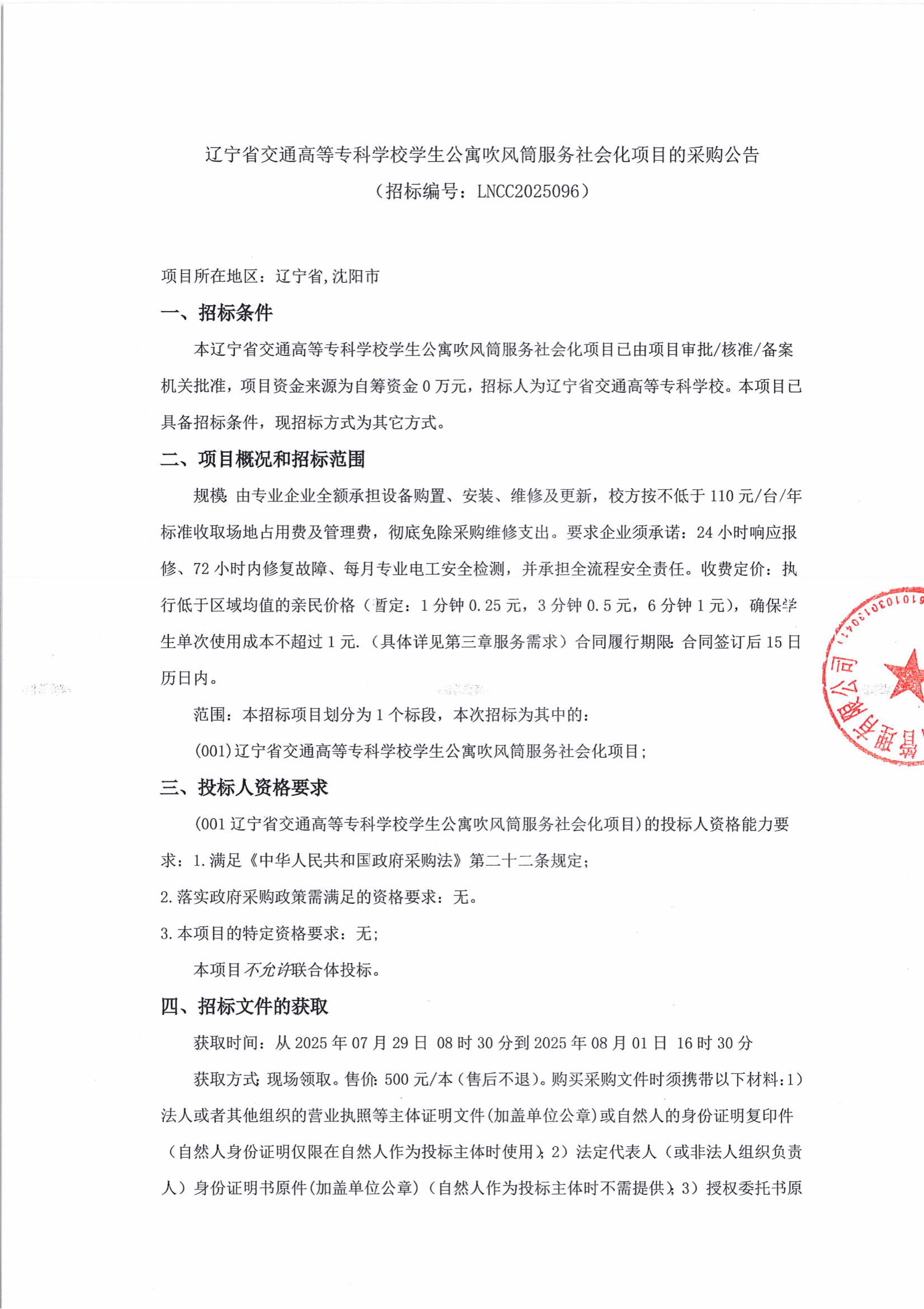 辽宁省交通高等专科学校学生公寓吹风筒服务社会化项目的采购公告(LNCC2025096)