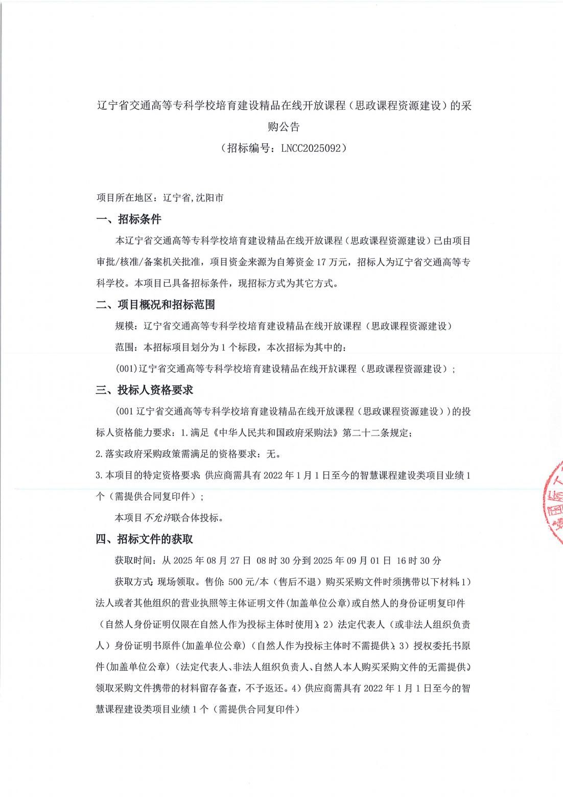 培育建设精品在线开放课程(思政课程资源建设)项目采购公告(LNCC2025092)