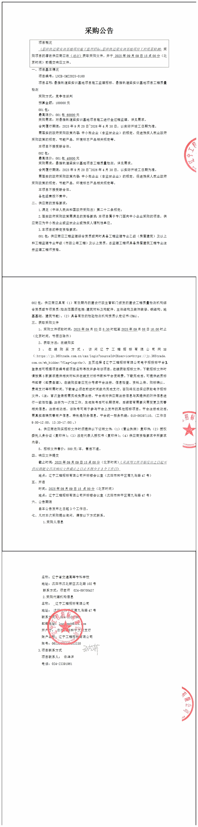 悬挂轨道梁实训基地项目施工监理招标、悬挂轨道梁实训基地项目工程质量检测-竞争性谈判公告