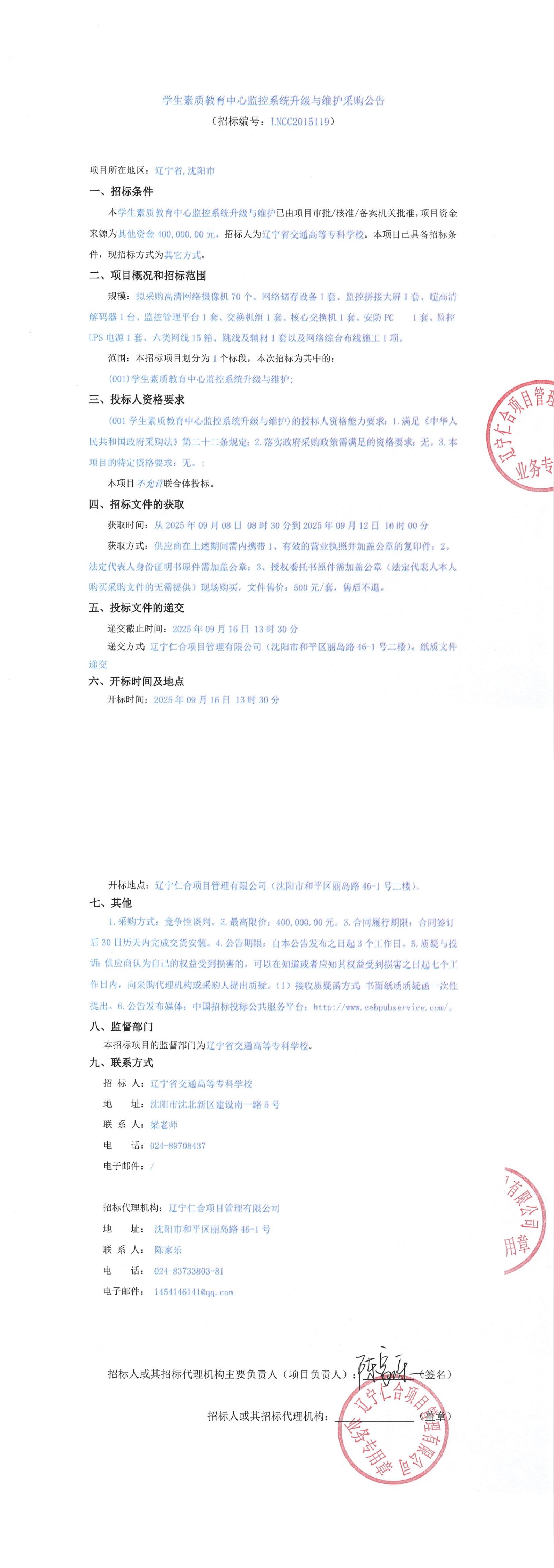 学生素质教育中心监控系统升级与维护采购公告(LNCC2015119)