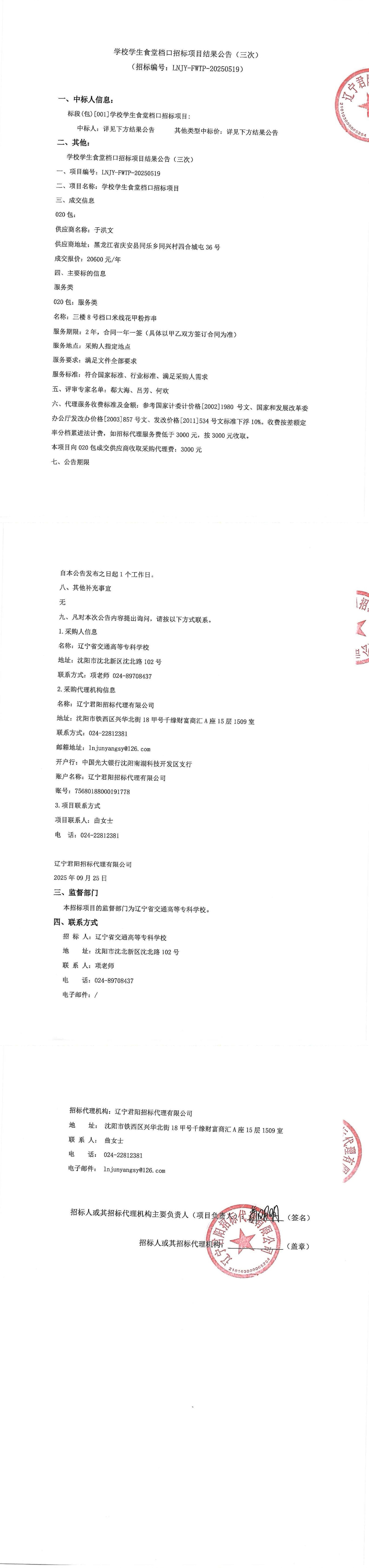 学校学生食堂档口招标项目结果公告(三次)