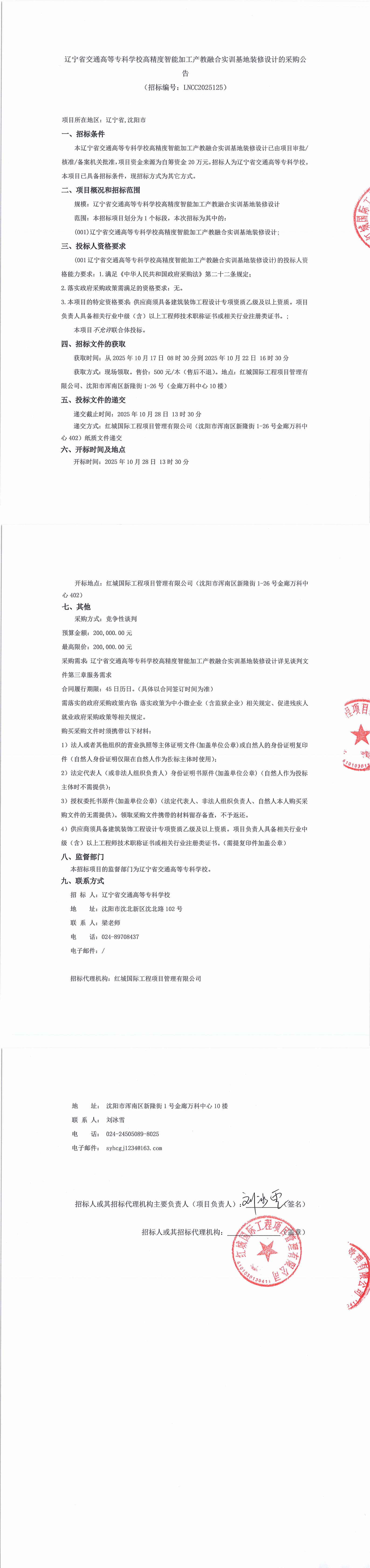 辽宁省交通高等专科学校高精度智能加工产教融合实训基地装修设计项目采购公告