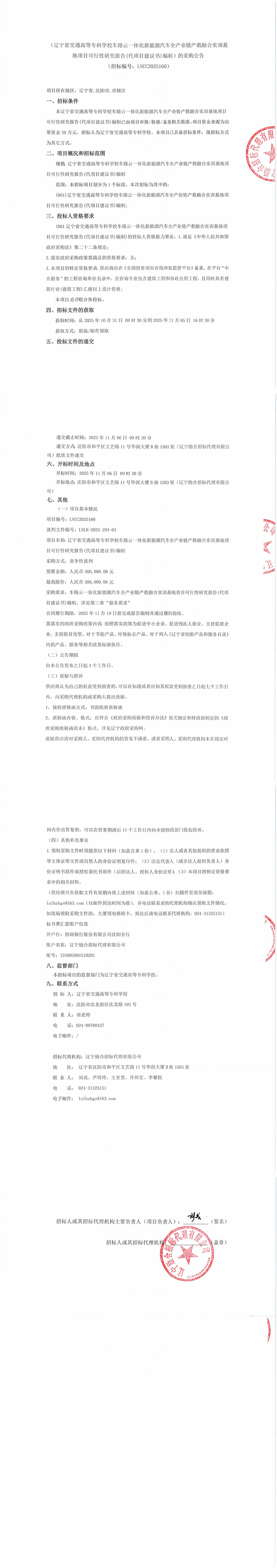 辽宁省交通高等专科学校车路云一体化新能源汽车全产业链产教融合实训基地项目可行性研究报告(代项目建议书)编制采购公告