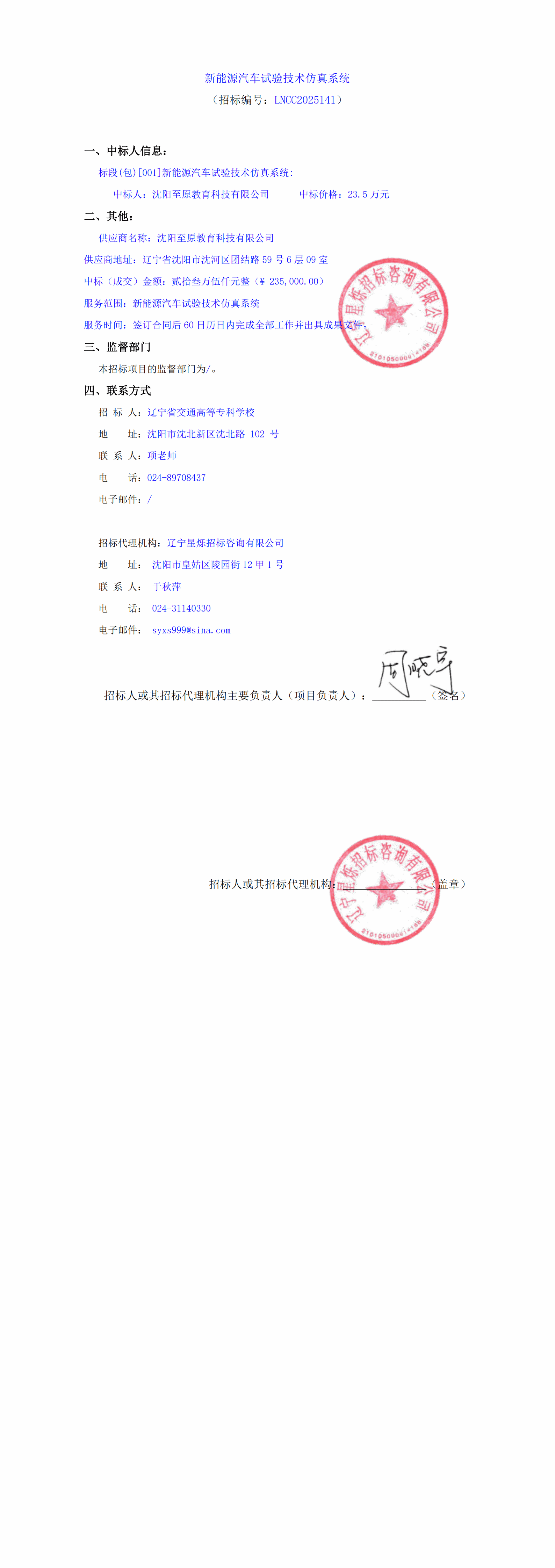 新能源汽车试验技术仿真系统结果公告(LNCC2025141)