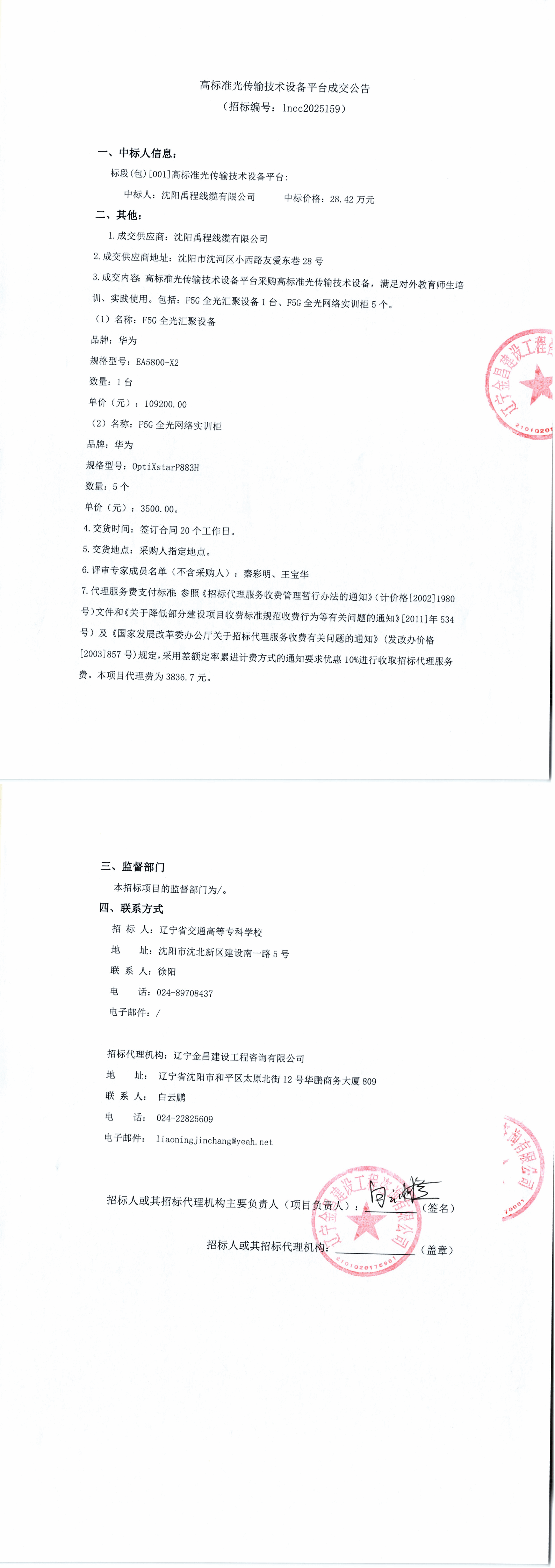 高标准光传输技术设备平台成交公告(LNCC2025159)
