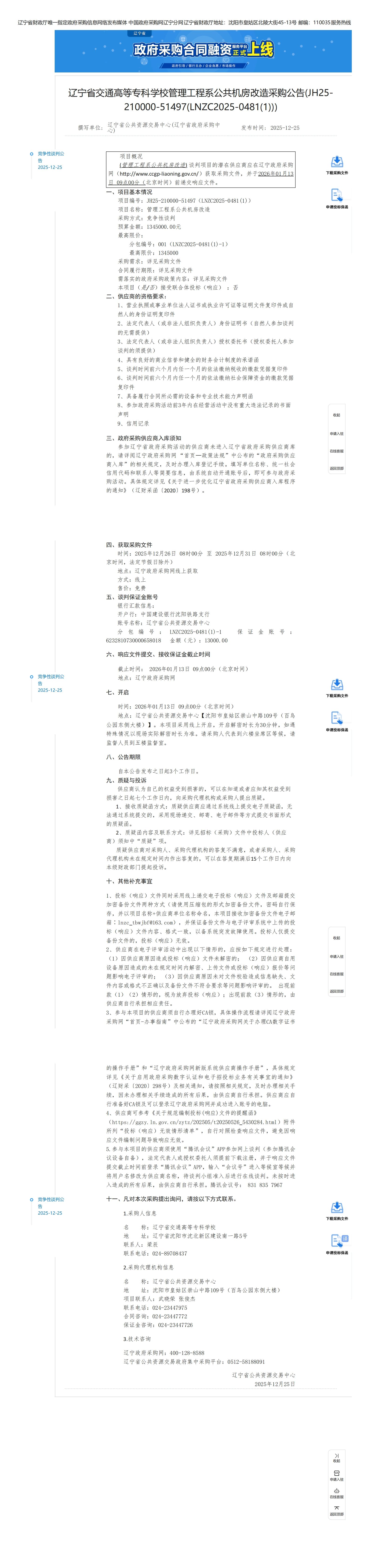 辽宁省交通高等专科学校管理工程系公共机房改造采购公告(JH25-210000-51497)