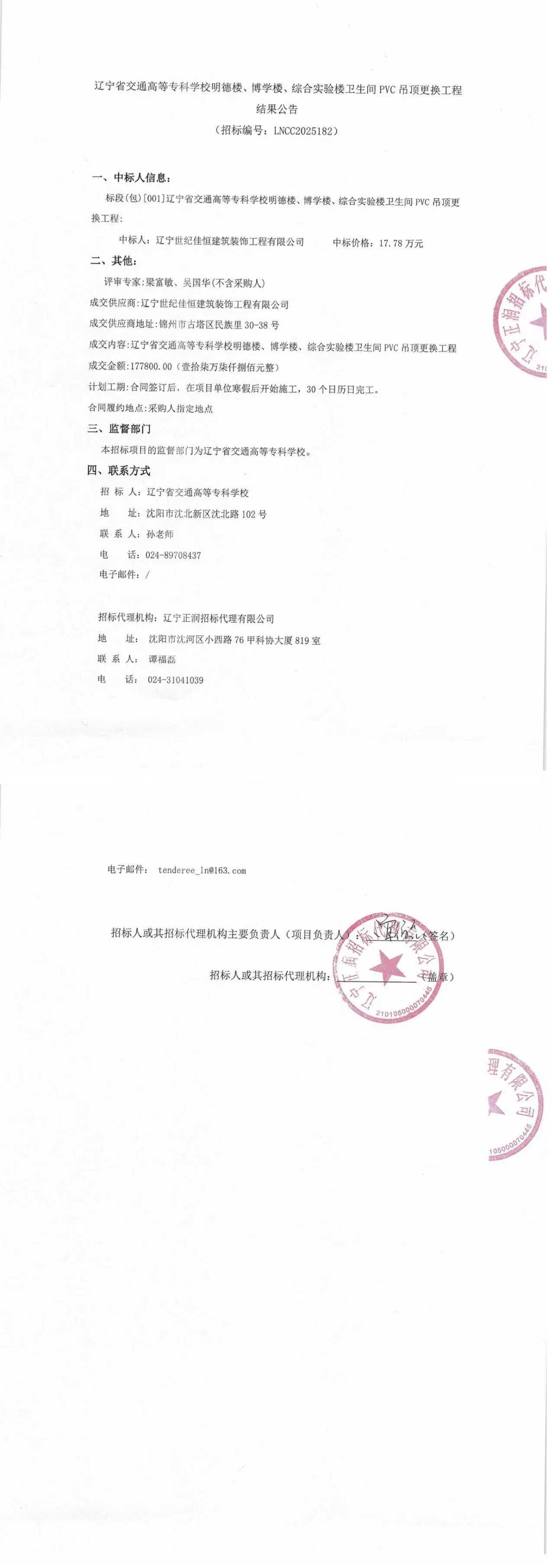 明德楼、博学楼、综合实验楼卫生间PVC吊顶更换工程采购结果公告(LNCC2025182)