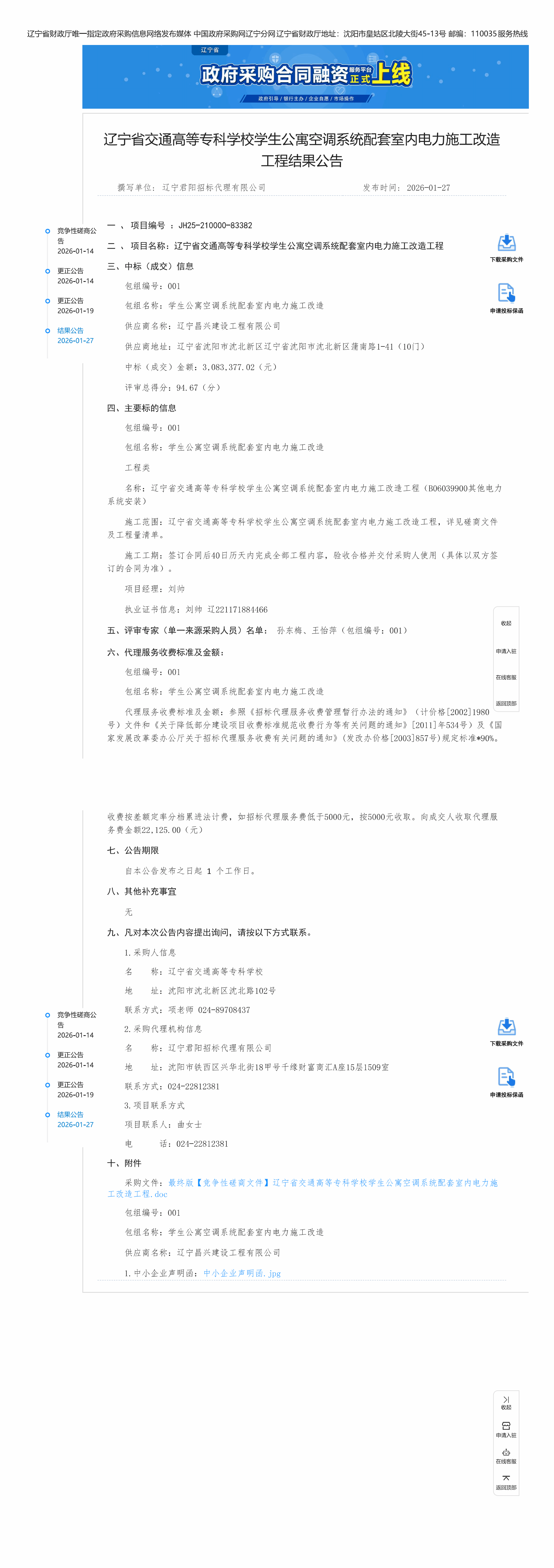 辽宁省交通高等专科学校学生公寓空调系统配套室内电力施工改造工程结果公告