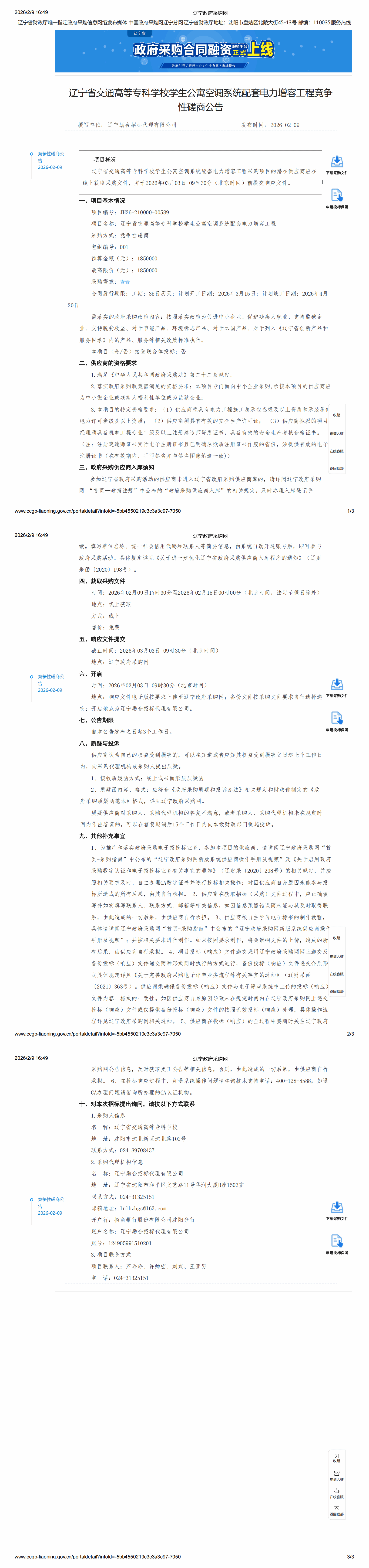 辽宁省交通高等专科学校学生公寓空调系统配套电力增容工程竞争性磋商公告