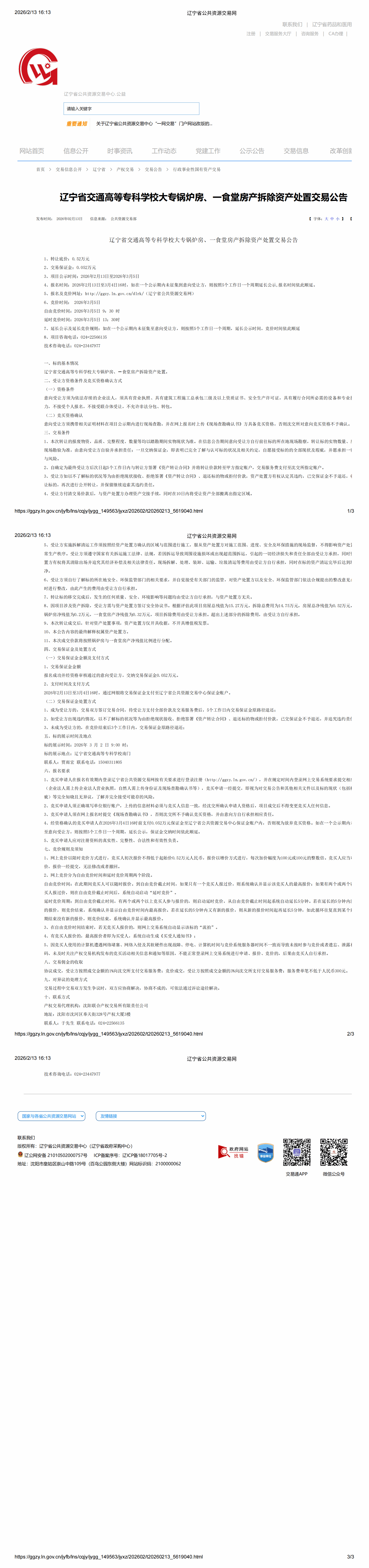 辽宁省交通高等专科学校大专锅炉房、一食堂房产拆除资产处置交易公告