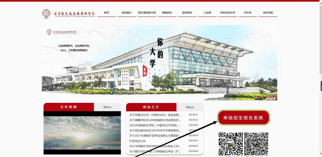 辽宁省交通高等专科学校2022年单独招生考试报名工作将于3月25日早9:00时(具体结束时间待定)开启,报名方式为网上报名,具体报名操作方法如下图所示: