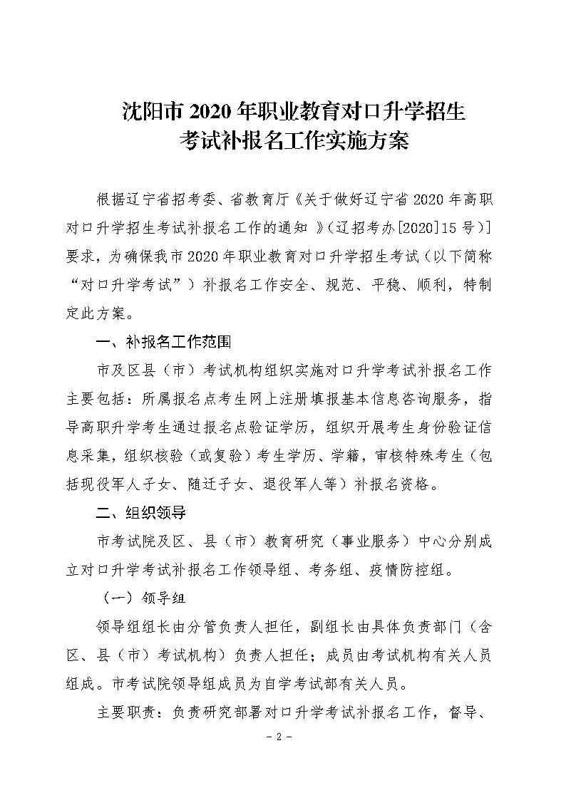 关于印发沈阳市2020年职业教育对口升学招生考试补报名工作实施方案的通知