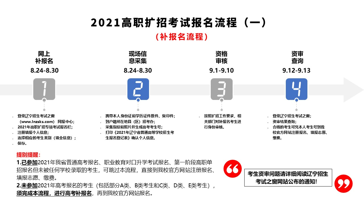 2.未参加2021年高考报名的考生(包括部分A类、B类考生和C类、D类、E类考生),须进行高考补报名,再参加高职扩招(第二阶段高职单招)。